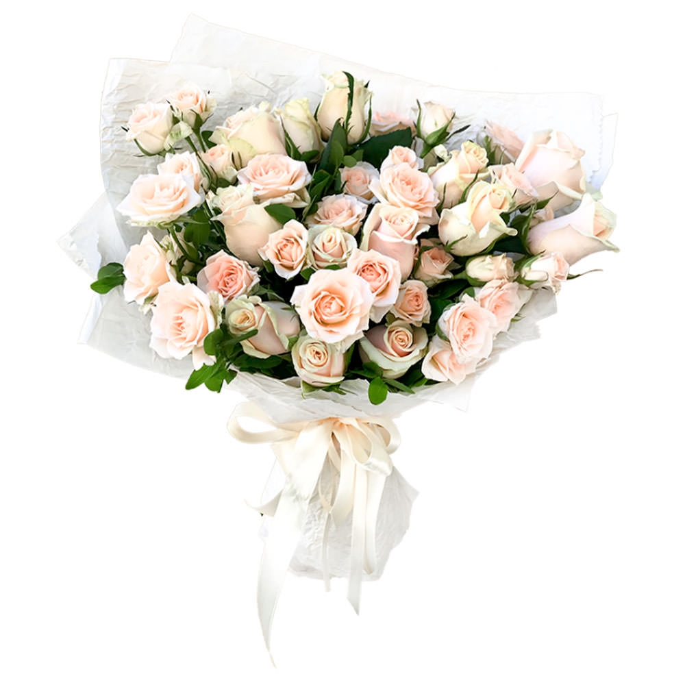 Роза кустовая кремовая, роза одноголовая. Упаковка (лента, пленка, крафт, сетка, пленка матовая)