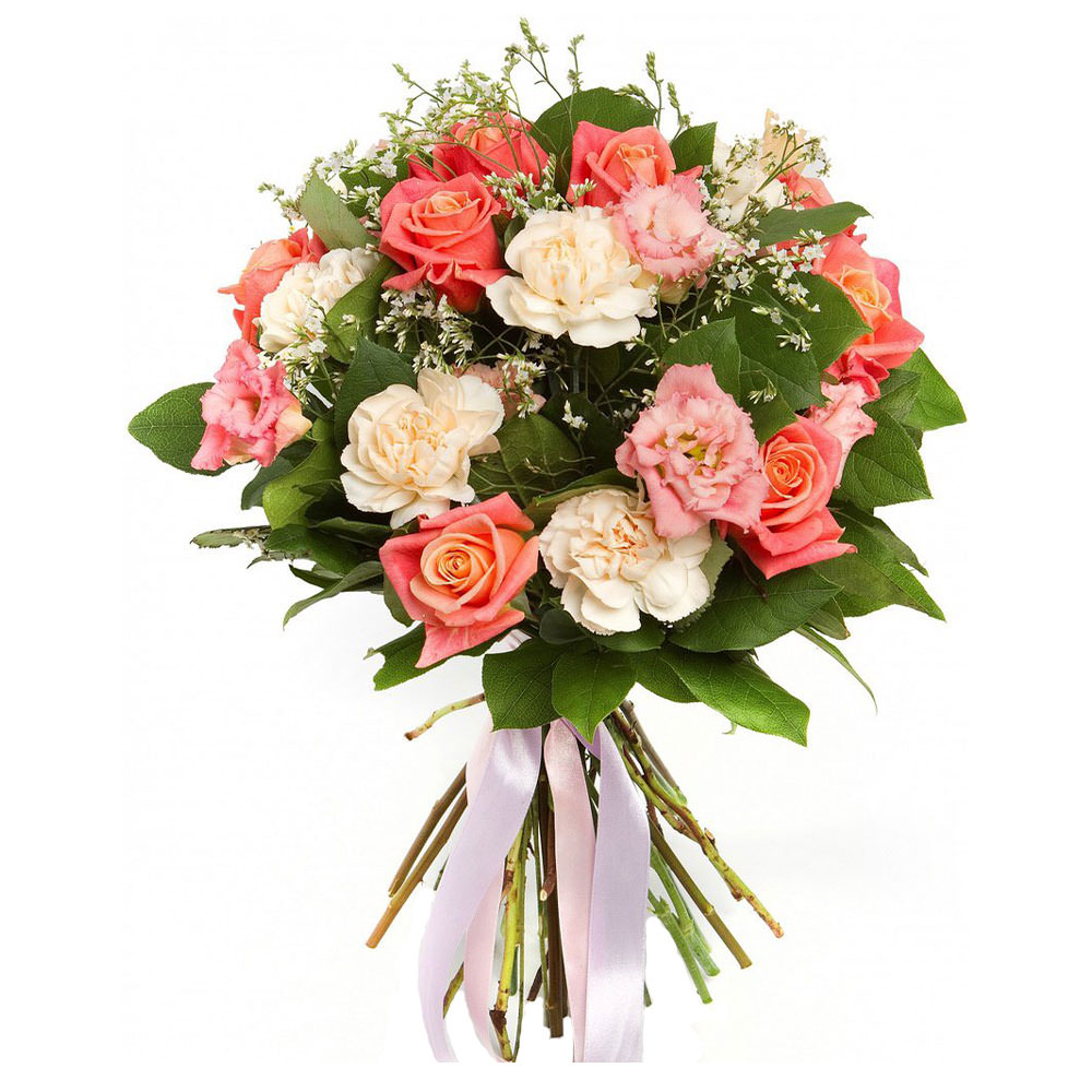 Роза одноголовая розово-персиковая, гвоздика кремовая, эустома розовая, зелень. Упаковка (лента, пленка, крафт, сетка, пленка матовая)