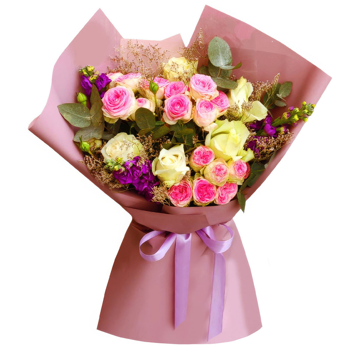 Роза одноголовая чайная, роза пионовидная кустовая розовая, маттиола фиолетовая, эвкалипт, лимониум. Упаковка (лента, пленка, крафт, сетка, пленка матовая)