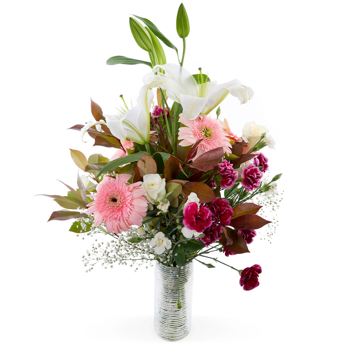 Лилия белая, гербера розовая, роза кустовая белая, гвоздика кустовая бордовая и белая, гипсофила. Упаковка (лента, пленка, крафт, сетка, пленка матовая)