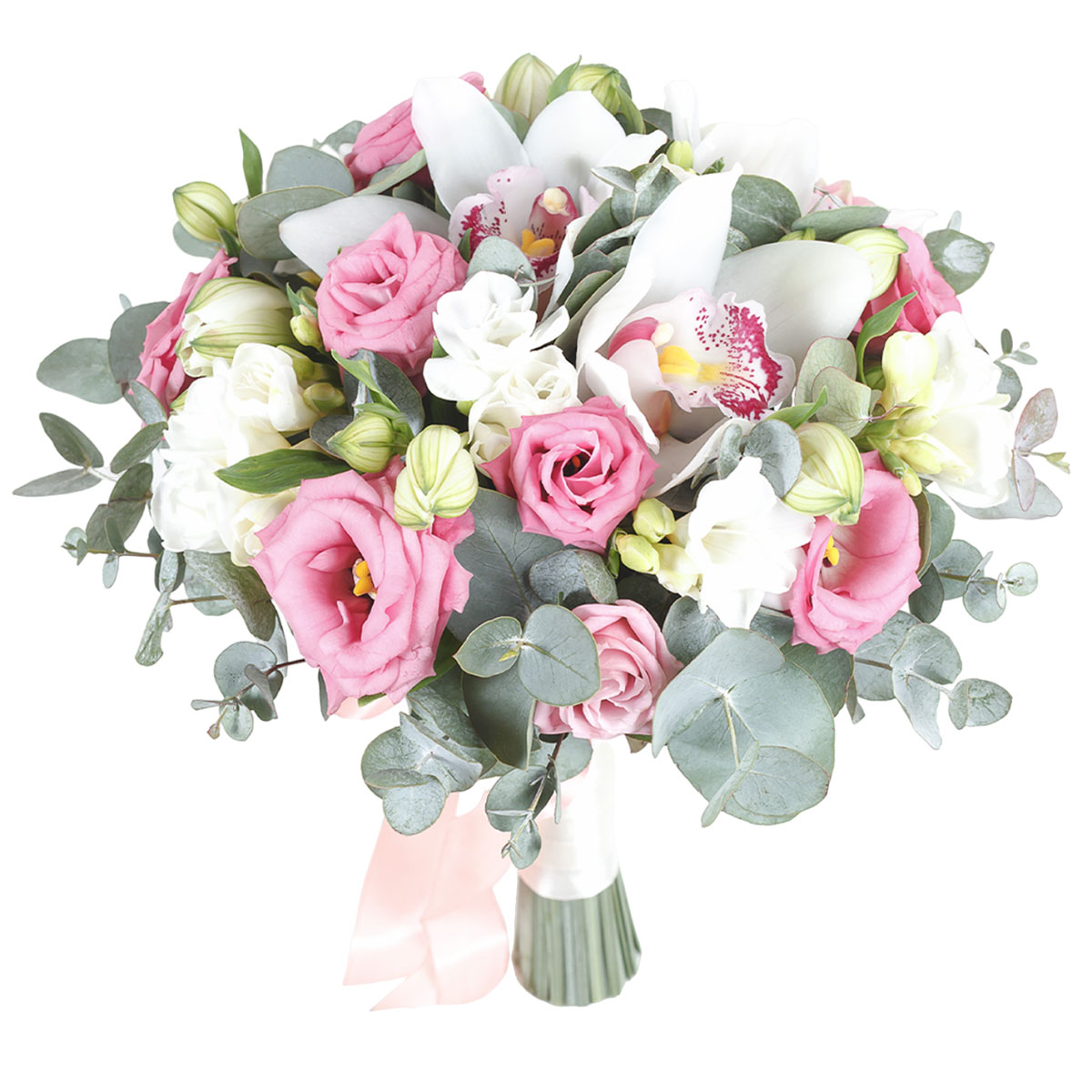 Орхидея белая, эустома розовая, фрезия белая, эвкалипт. Упаковка (лента, пленка, крафт, сетка, пленка матовая)