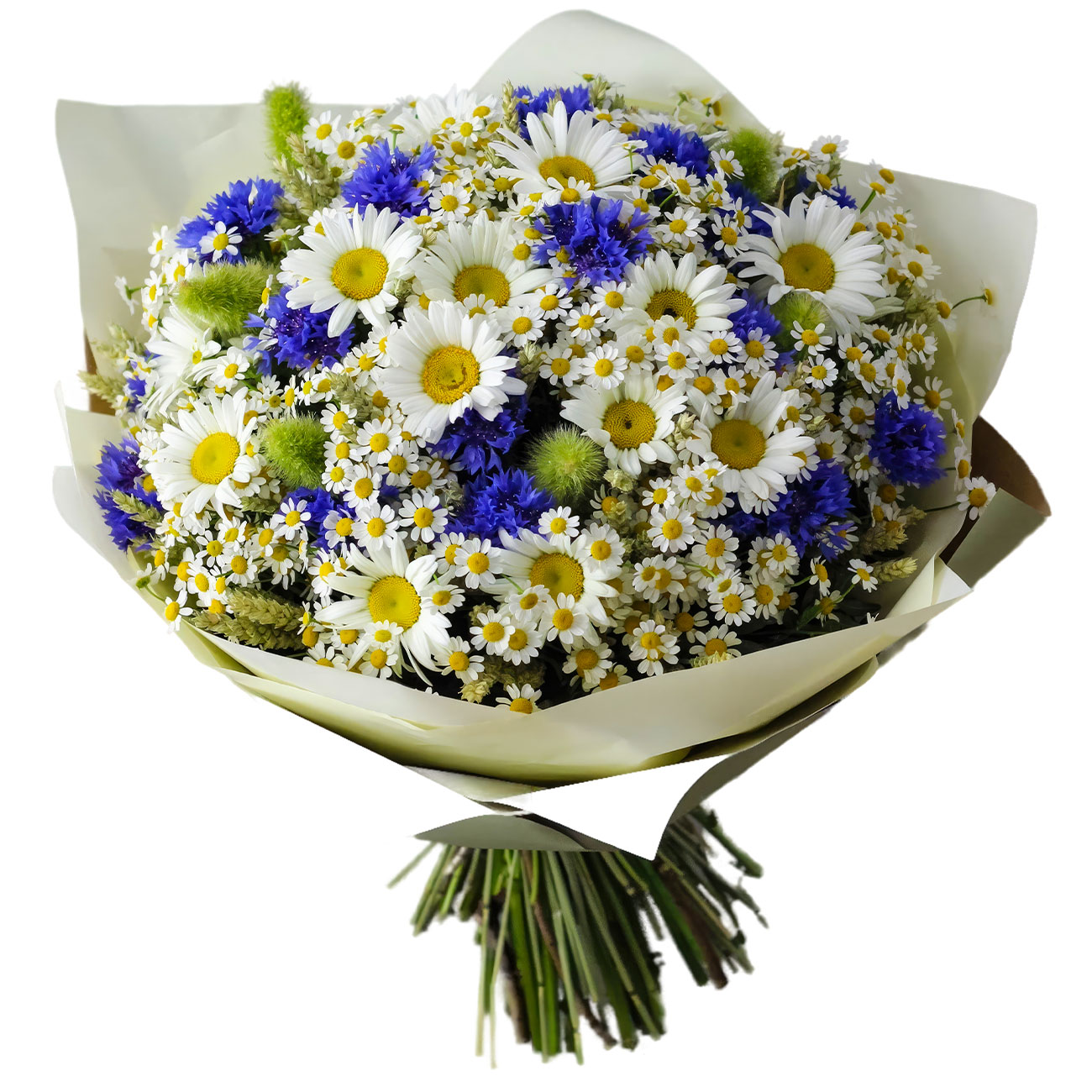 Васильки, ромашка, зелень. Упаковка (лента, пленка, крафт, сетка, пленка матовая)