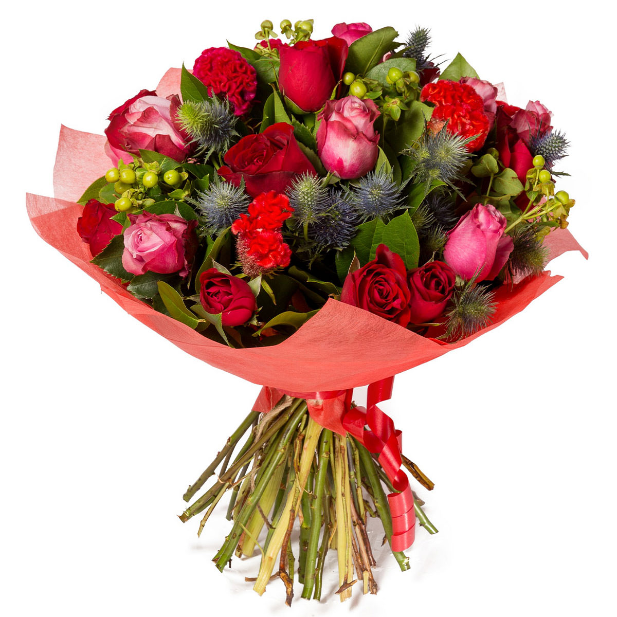 Роза одноголовая красная и розовая, эрингиум, гиперикум, целозия. Упаковка (лента, пленка, крафт, сетка, пленка матовая)