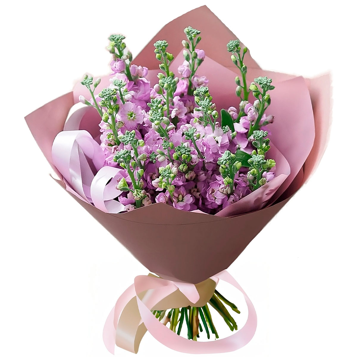 Маттиола нежно-розовая, зелень. Упаковка (лента, пленка, крафт, сетка, пленка матовая)