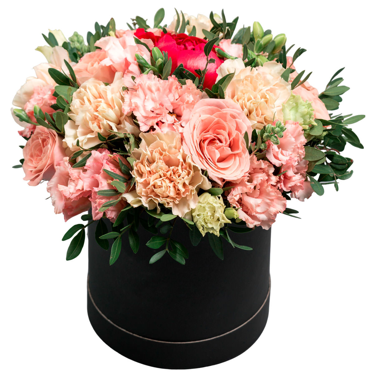 Роза одноголовая розовая, эустома розовая, пион розовый, гвоздика кремовая, эвкалипт. Упаковка (шляпная коробка, квадратный бокс, коробка сердце, оазис)