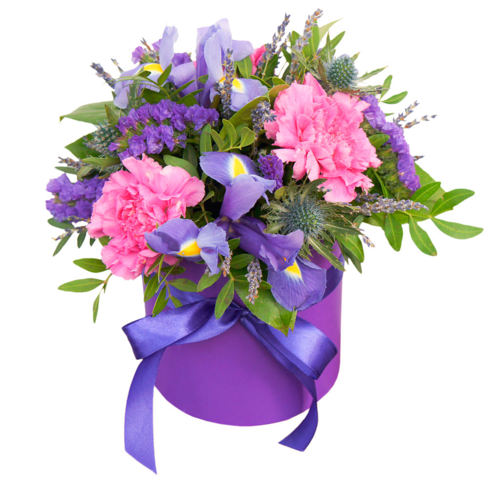 Гвоздика розовая, ирис, лимониум, эрингиум, фисташка, статица. Упаковка (шляпная коробка, квадратный бокс, коробка сердце, оазис)